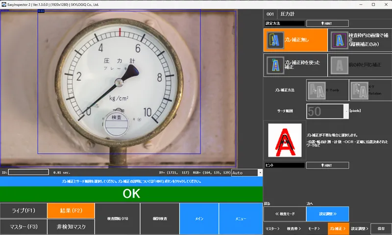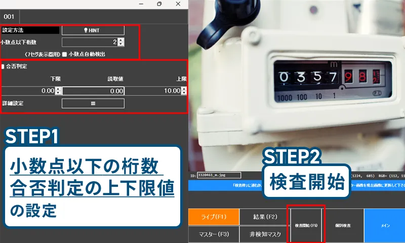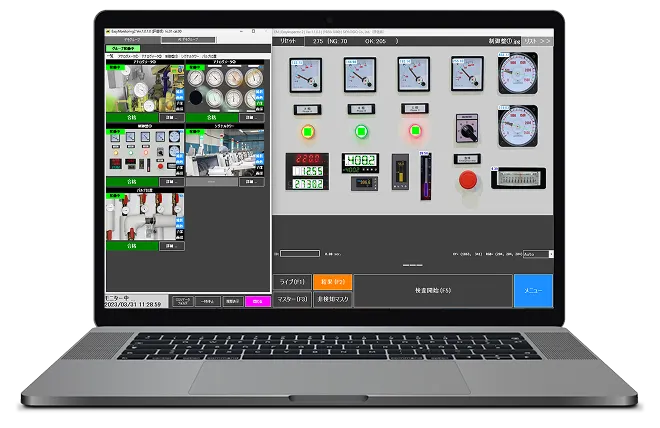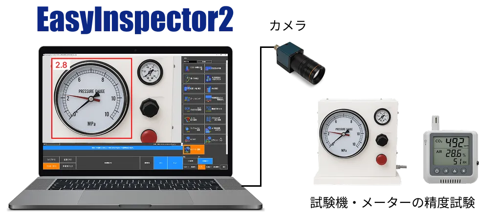 カメラでメーターを継続的に撮影し、PC内で高速処理して即時に値を読み取ることができます。試験機の値の読み取り・速度計、流量計、ガス濃度計などの出荷検査のような長時間・高頻度でデータを取り続けたい現場に適した構成で、高速な読み取りと安定した合否判定を実現します。