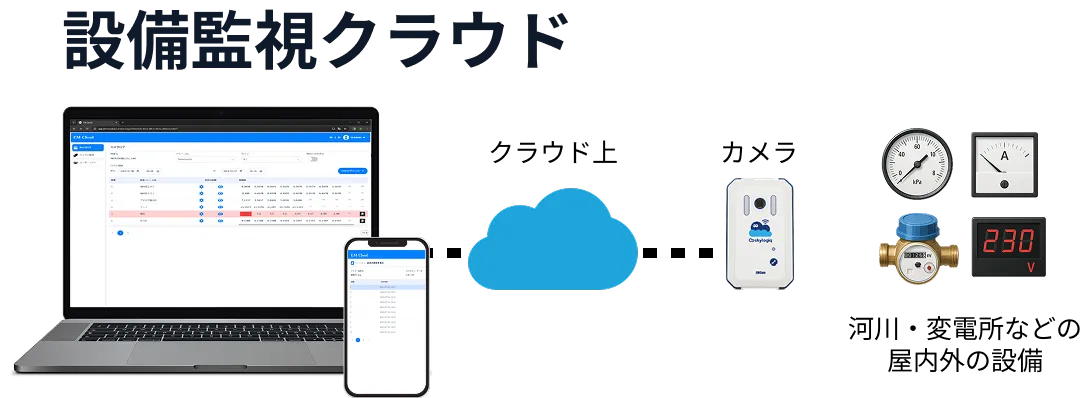 カメラを設置するだけで、クラウド上でメーター読取・記録・異常通知まで自動処理。画像処理PCを用意する必要がなく、離れた複数拠点の設備状態をクラウドから一元管理できます。LANが整っていない遠隔地・屋外設備でも導入しやすく、柔軟な運用が可能です。